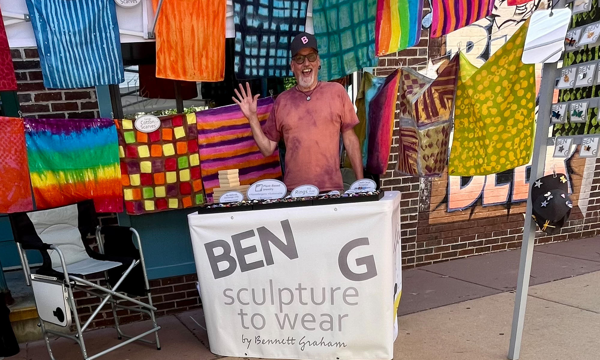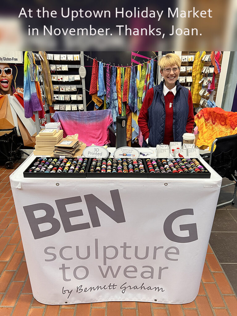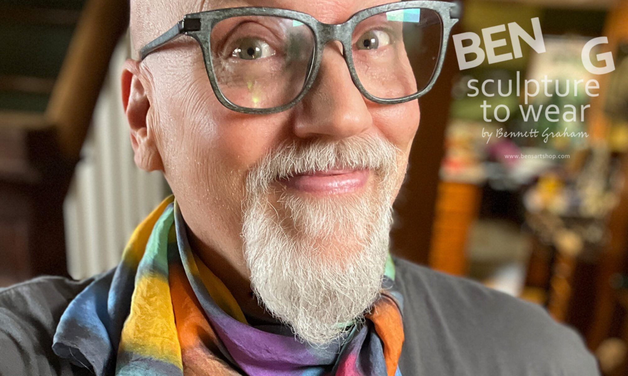The jewelry is 3D printed at Ben G’s studio out of a plant-based polymer called PLA. This substance is durable, lightweight, waterproof and hypoallergenic. What’s more, it is a renewable and sustainable resource. Ben G hand colors the silk and rayon scarves one-by-one. “No two are alike for sure”, he says. “I couldn’t make a matching scarf if I wanted to so that’s one reason I don’t take orders very often.” All jewelry and textiles are signed with the Ben G logo to confirm it is an original art piece by Ben G, and making it authentic and collectable.